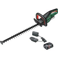 The UNIVERSALHEDGECUT 18-50 is an 18v cordless hedge trimmer which is powered by a PowerForAll lithium ion battery, meaning it shares battery compatibility with a wide range of products for the home and garden, not only from Bosch but also from other manufacturers who have incorporated the battery platform into their cordless ranges. The UNIVERSALHEDGECUT 18-50 has a 500mm blade and an ergonomic housing with a two handed safety start. A blade tip protector helps prevent accidental damage to the teeth when working close to hard surfaces like brick walls and concrete paving. This is the bare tool model which is supplied without a battery or charger. Specifications • Battery Voltage: 18v • Battery Type: PowerForAll Lithium Ion • Blade Length: 500mm Features and Benefits • Cordless hedge trimmer on the PowerForAll battery platform • Shares battery compatibility with alll tools in the Power For All 18v Alliance • Compatible with all PowerForAll 18v batteries • Two handed safety start • Ergonomic housing for comfortable grip • Blade tip protector helps prevent accidental damage to the teeth Contents • UNIVERSALHEDGECUT 18-50 18v Cordless Hedge Trimmer (bare tool) • No Battery • No Charger